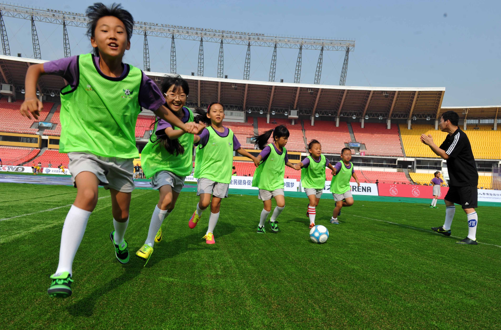 2014年8月8日“全民健身促健康 同心共筑中国梦”全民健身日主题活动中,小朋友在工人体育场进行足球训练展示。(新华社记者公磊摄)