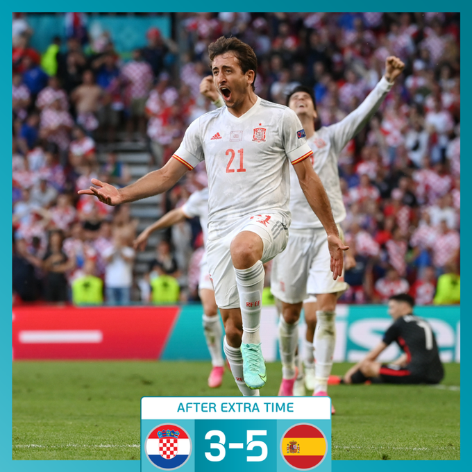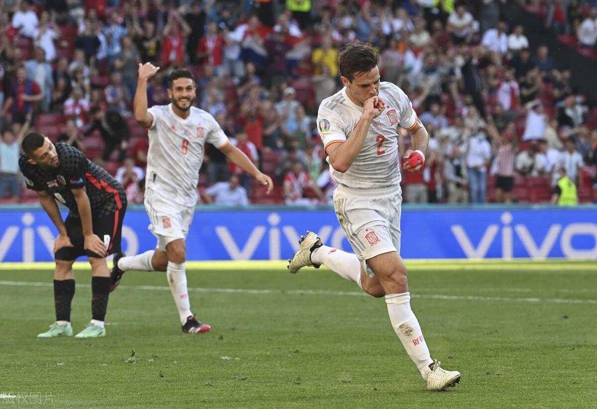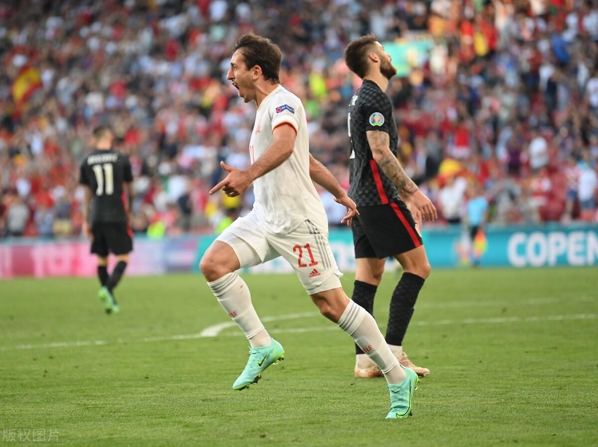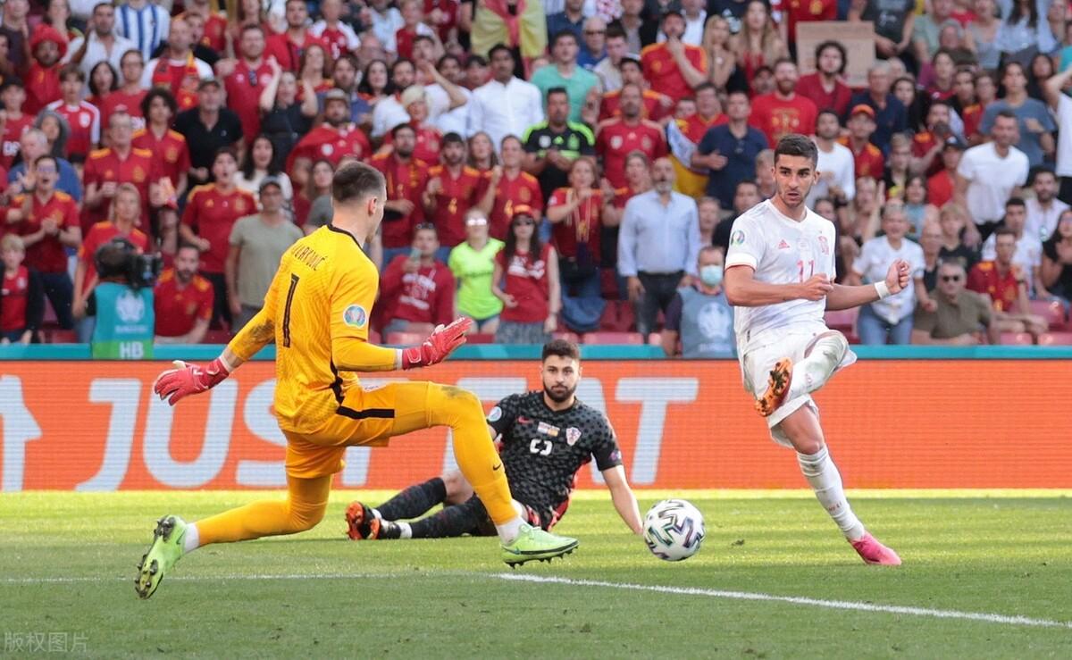 加时赛第104分钟,奥尔莫突破后横传,奥亚萨瓦尔中路破门,西班牙5-3克罗地亚。