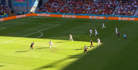 第100分钟,西班牙右侧起球送禁区,防守球员没有顶到位,莫拉塔停球下来起左脚爆射近角破门。西班牙队再次领先。