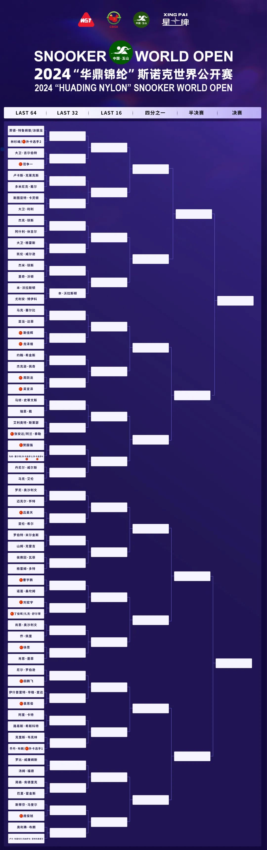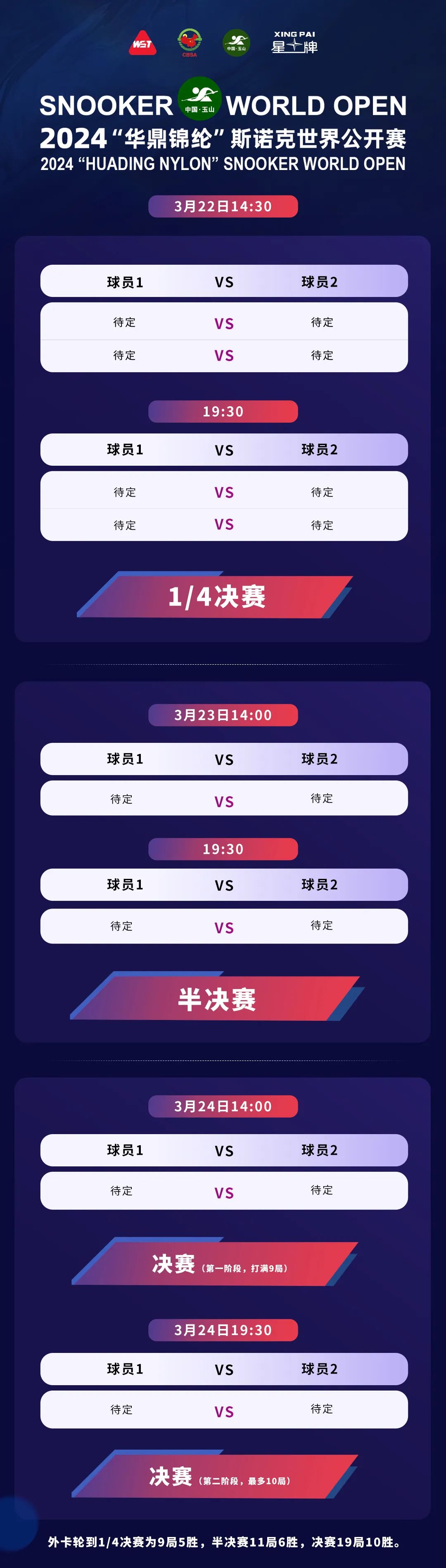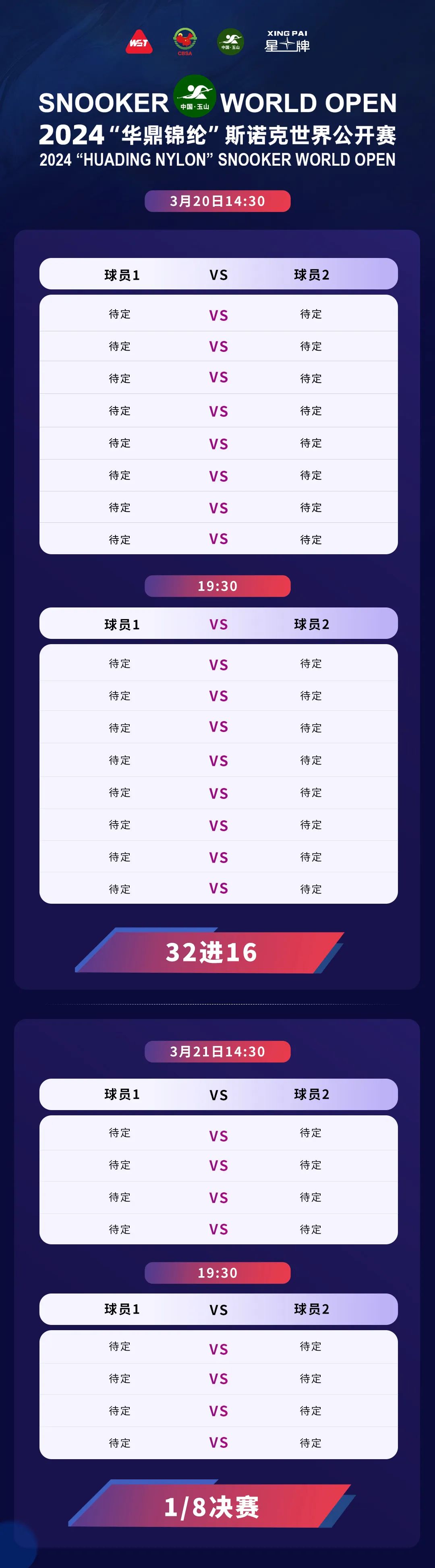 关于斯诺克世界公开赛 斯诺克世界公开赛历史悠久,是一项创立已经超过40年的斯诺克赛事,也是除世锦赛之外的第一个斯诺克职业积分排名赛。世界公开赛2012年进入中国,2012年—2014年连续三次在海南举办,2016年来到“中国台球之都、世界台球名城”玉山。 中国·江西·上饶·玉山2024“华鼎锦纶”斯诺克世界公开赛总奖金达81.5万英镑,冠军17万英镑。本届比赛囊括斯诺克当今几乎所有顶尖球员,丁俊晖、奥沙利文、特鲁姆普、塞尔比、希金斯等世界明星悉数参加,19位中国球员主场作战。 斯诺克世界公开赛赛程 目前3月18日、19日的完整赛程及台号安排已经出炉。3月18日9:30, 2023年世锦赛冠军布雷切尔在1号台打响揭幕战,对阵泰国球员菲特玛莱库尔。14:30, 上届赛会冠军特鲁姆普在1号台开启卫冕之旅,对手是马来西亚球员涂振龙。19:30, “中国一哥”丁俊晖打响首战, 对手是英格兰球员舒尔蒂。3月19日19:30, 现世界第一奥沙利文将迎来玉山首秀, 对手是威尔士球员小怀特。丁俊晖如果首战获胜,当天14:30 在1号台和中国小将刘宏宇上演德比战。 斯诺克世界公开赛签表 如何购买世界公开赛门票? 四种 购票方式带你去观赛: