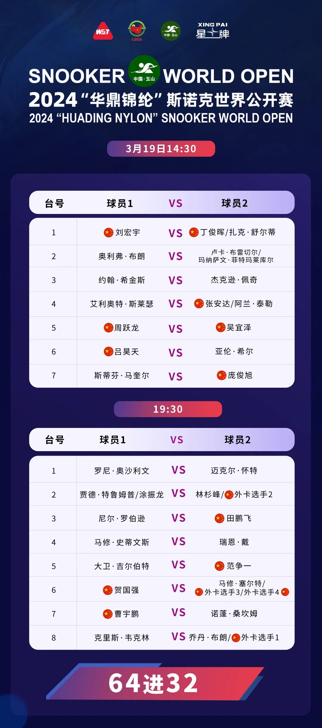 3月19日19:30,现世界第一奥沙利文将迎来玉山首秀, 对手是威尔士球员小怀特。丁俊晖如果首战获胜,当天14:30 在1号台和中国小将刘宏宇上演德比战。
