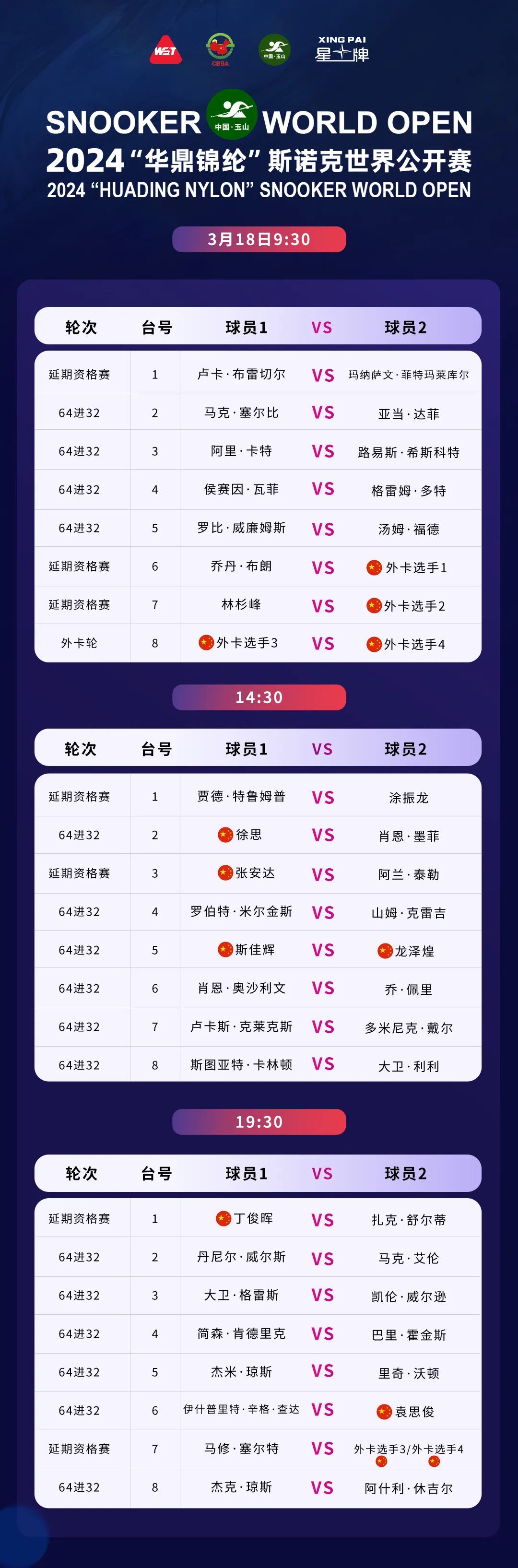 3月18日9:30, 2023年世锦赛冠军布雷切尔在1号台打响揭幕战,对阵泰国球员菲特玛莱库尔。14:30, 上届赛会冠军特鲁姆普在1号台开启卫冕之旅,对手是马来西亚球员涂振龙。19:30,“中国一哥”丁俊晖打响首战, 对手是英格兰球员舒尔蒂。