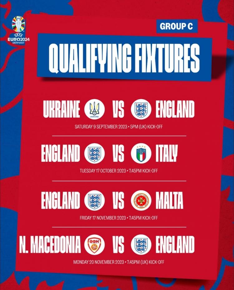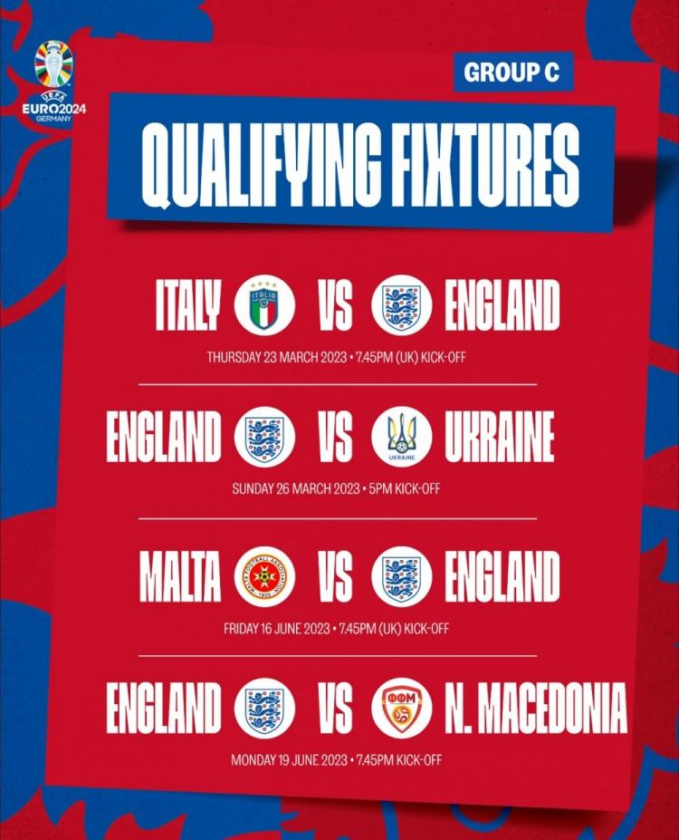 直播吧10月10日讯 英格兰国家队在社交媒体上晒出了2024年欧洲杯预选赛的赛程,三狮军团将在2023年3月23日、10月17日对阵意大利。
