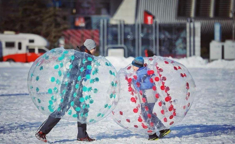 嬉雪乐园里冰上自行车、碰碰车,雪地迷宫、坦克