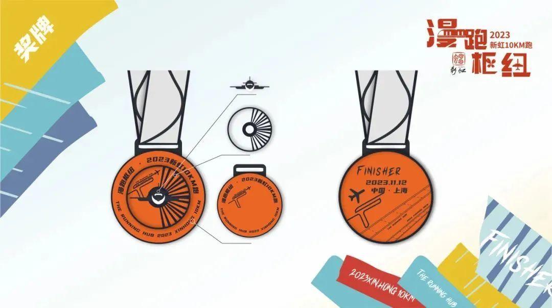 奖牌设计理念加入了高铁与机场等交通枢纽的元素,这正是新虹地区的特点,三层立体奖牌点题了赛事主题“漫跑枢纽”。