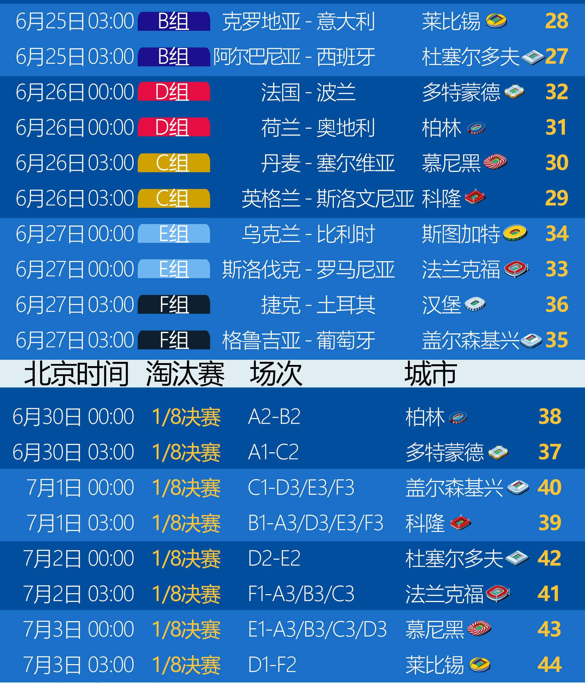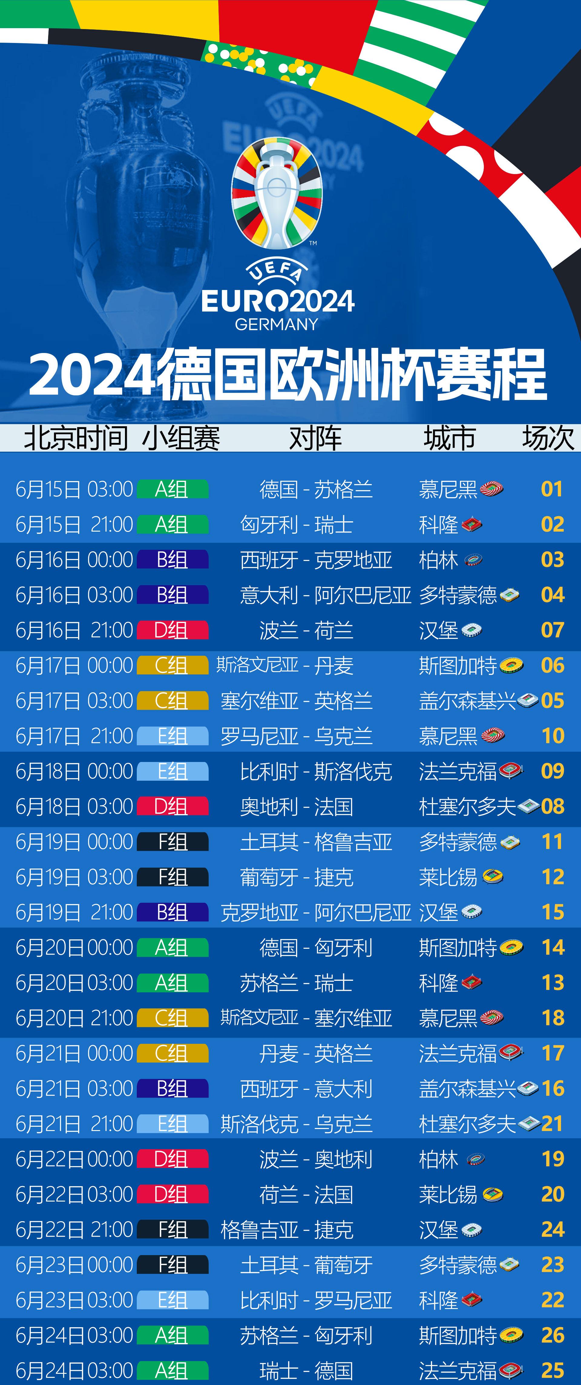 欧洲杯首场比赛也就是揭幕战必然是由东道主德国队主场迎战苏格兰 ,承办该项赛事一共有多达10座足球体育场。决赛则将在7月14日的柏林夜空下,奥林匹克体育场将见证新一代欧洲冠军的加冕。在这个历史性的夜晚,无论是老球迷还是新面孔,都将屏息以待,看谁能将那座象征着欧洲足球最高荣誉的奖杯高高举起,成为新一代绿茵场上的新传奇,将名字永远的刻在欧洲足球的历史丰碑上。