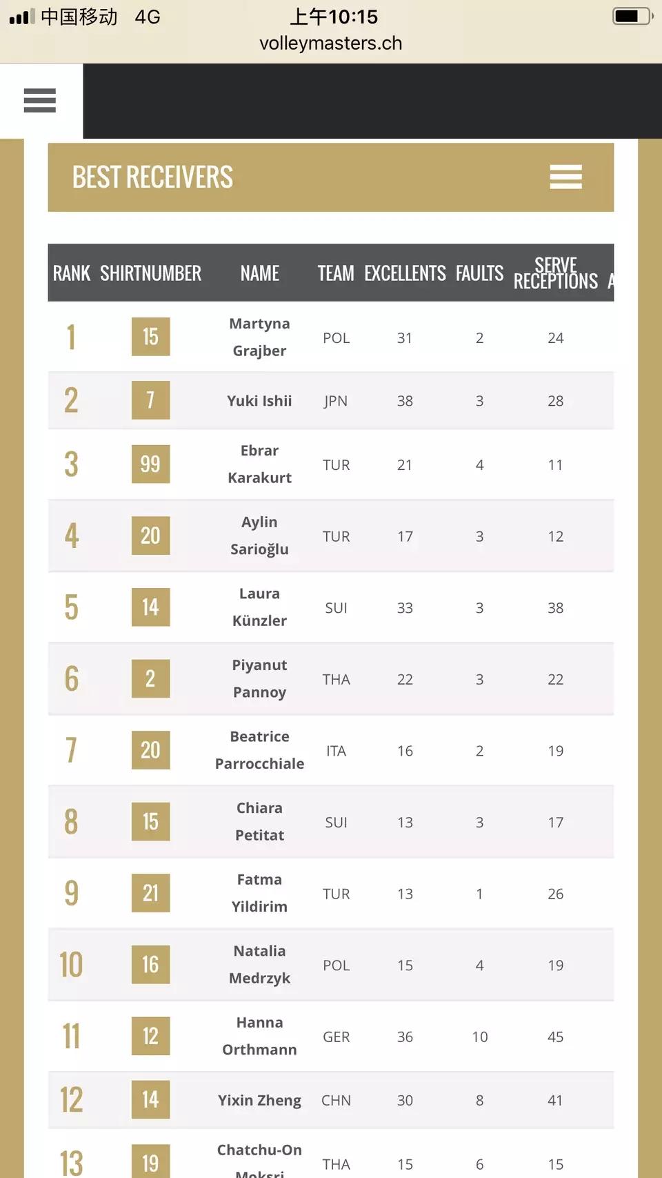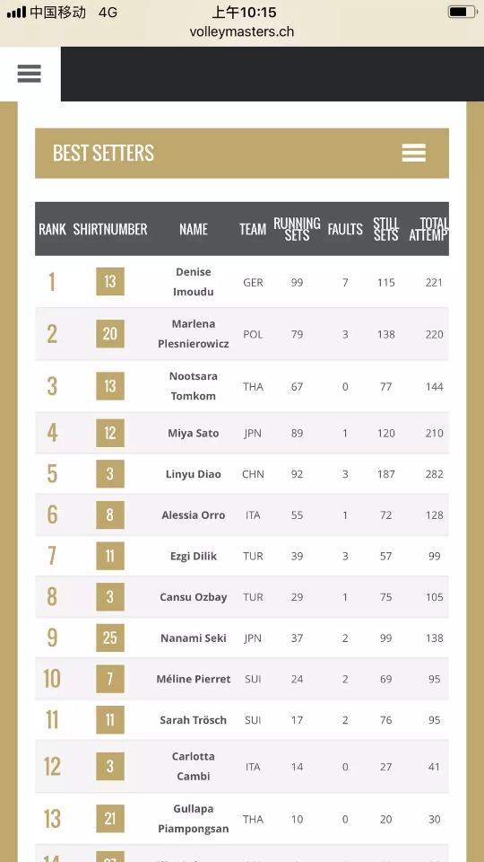 瑞士女排精英赛第三天战罢,中国女排三场比赛取得了两胜一负积5分暂列小组第二,能否进入四强需要看同组德国女排和波兰女排的比赛结果,目前各项技术统计也已经出炉,因为有些球队少打一场比赛,数据排名暂时不能客观反映出球员的真实水平,不过中国女排小组的比赛已经打完了,从这些数据统计上也可以看出来中国女排本次比赛哪些技术环节发挥好,哪些技术环节发挥不佳。