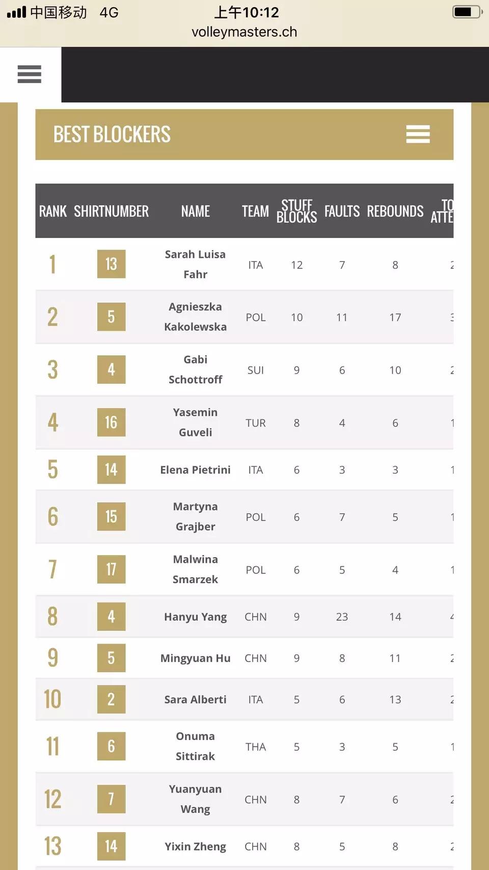在拦网方面,中国女排的杨涵玉和胡名媛位列第八和第九,本次比赛中国女排的拦网发挥相当出色,三场比赛拦网得分均完胜对手,本次比赛三名副攻王媛媛、胡名媛、杨涵玉的拦网都发挥高水平,虽然她们的移动拦网还有很多不足,但是定点拦网确实不错,期待她们接下来还能继续进步,拦网排名第一的是意大利女排副攻手法尔,排名第二的是波兰女排的副攻孔科莱夫斯卡。