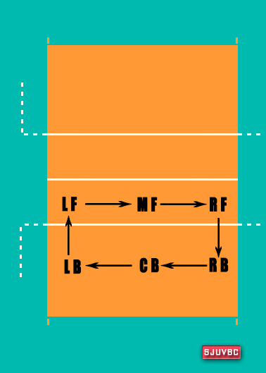 当其中的一名主攻轮转到后排发球位置,那么另外一名主攻就会从后排轮转到前排左侧位置。这样以来前排总会有一名主攻、一名副攻和二传或者接应。