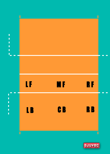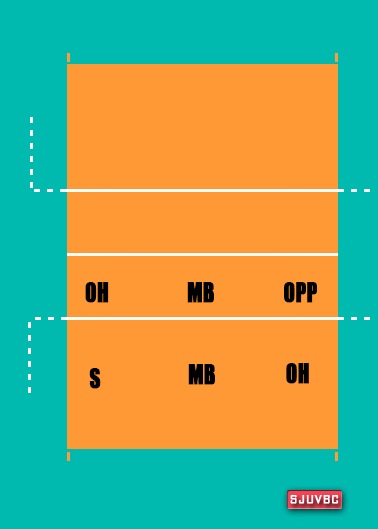 在场上一般有五个不同职能位置,通常情况下他们时前后镜面的关系,跟确切的说两个相同职能位置人的连线过场地中间的位置,成对角线的关系,例如主攻的位置-如果其中一名主攻(OH)在前排左侧位置,那么另一名主攻就在后排右侧的位置,图示就是其中的一种站位。在比赛开始时可以有很多种站位选择,但是一旦比赛开始站位就不能改变(直到本局比赛结束)。