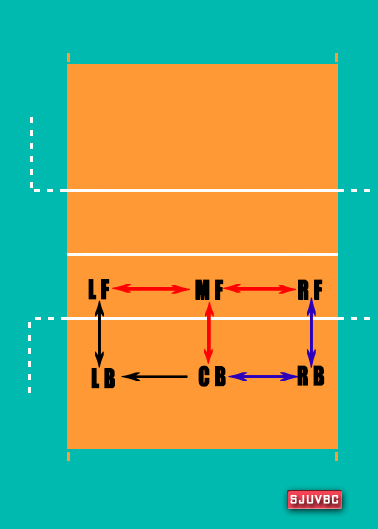 最好的方法是用图示表示,如图中所示蓝色箭头代表后排右侧队员需要注意的位置关系,同样的前排左侧队员也要注意自己要处在左侧后排队员的前方,前排中间球员的左侧,我们可以把这种适用于左右两侧的位置关系叫做,上下的L型站位关系。