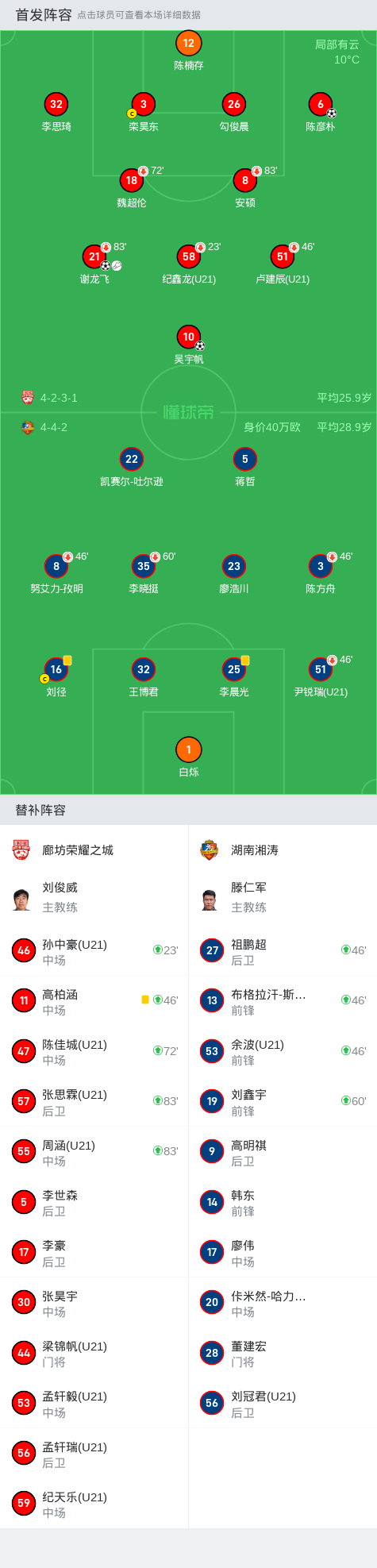 第51分钟,廊坊荣耀之城球员谢龙飞助攻陈彦朴打入一球。