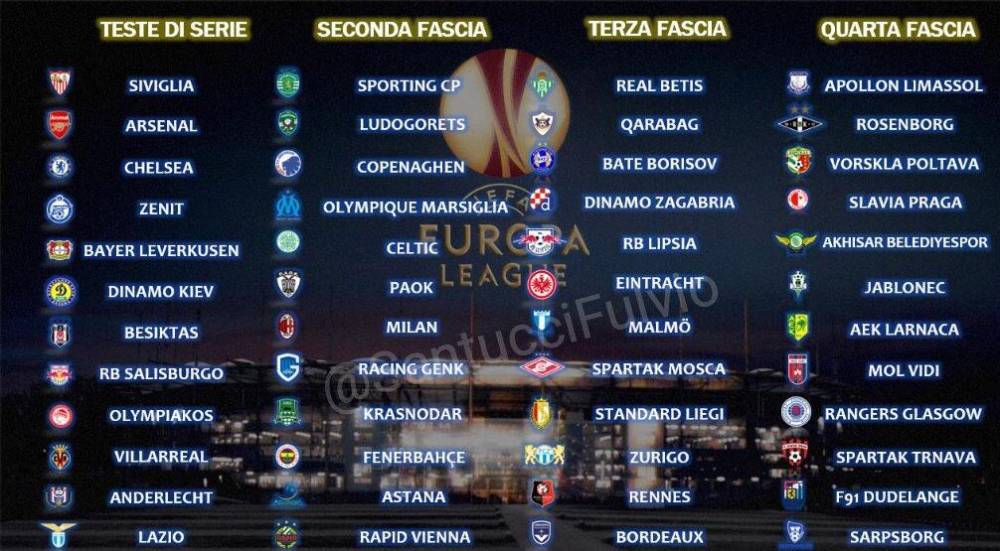 48支球队分档如下图:阿森纳、切尔西、勒沃库森、塞维利亚等豪强在第一档,第二档的强队则有AC米兰、马赛和葡萄牙体育。