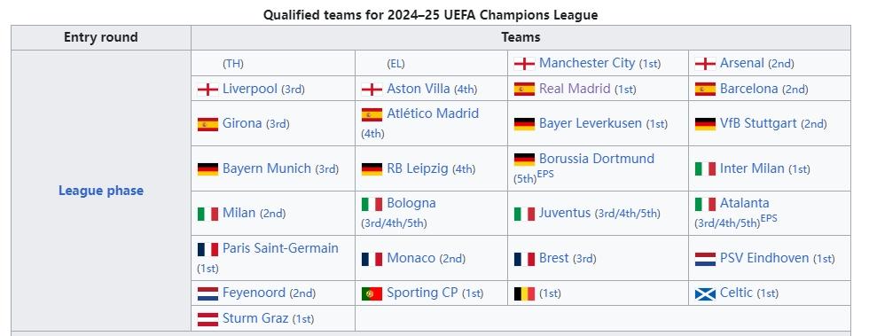 24-25赛季欧冠36个席位分配↓