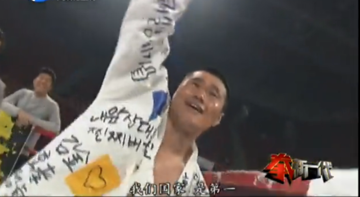 2013年9月11日武林风喀什站中外对抗赛中KO泰国选手:坤善猜(取得了32战全胜纪录。)