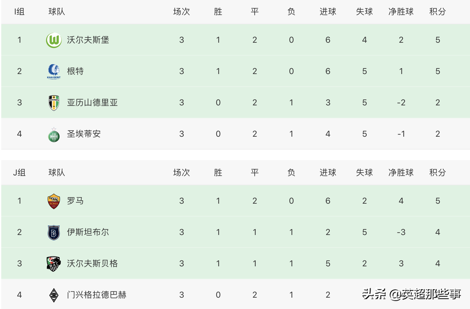 I组中,沃尔夫斯堡客场2-2战平根特,继续保持不败战绩,两队分居积分榜一二位,圣埃蒂安主场1-1战平亚历山德里亚,两队依然不胜。J组中,罗马主场1-1战平门兴,扎尼奥罗头球破门,客队补时阶段点球绝平;伊斯坦布尔主场1-0击败沃尔夫斯贝格,升至积分榜第2位。