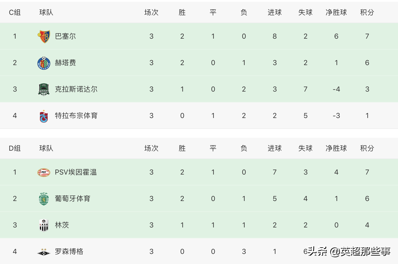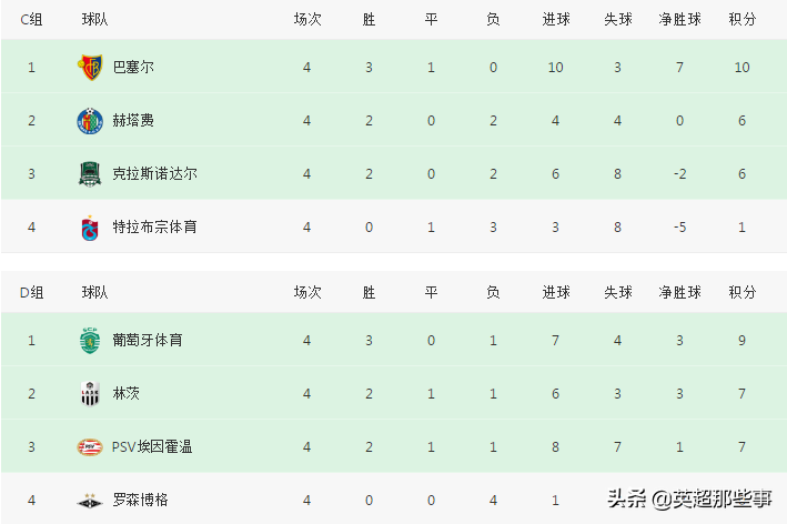 C组中,巴塞尔客场1-0击败赫塔菲,超越对手,3战积7分升至榜首;克拉斯诺达尔客场2-0击败特拉布宗体育,取得首胜。D组中,埃因霍温主场0-0战平林茨,继续位列榜首;葡萄牙体育主场1-0击败罗森博格,积6分位列小组第2。