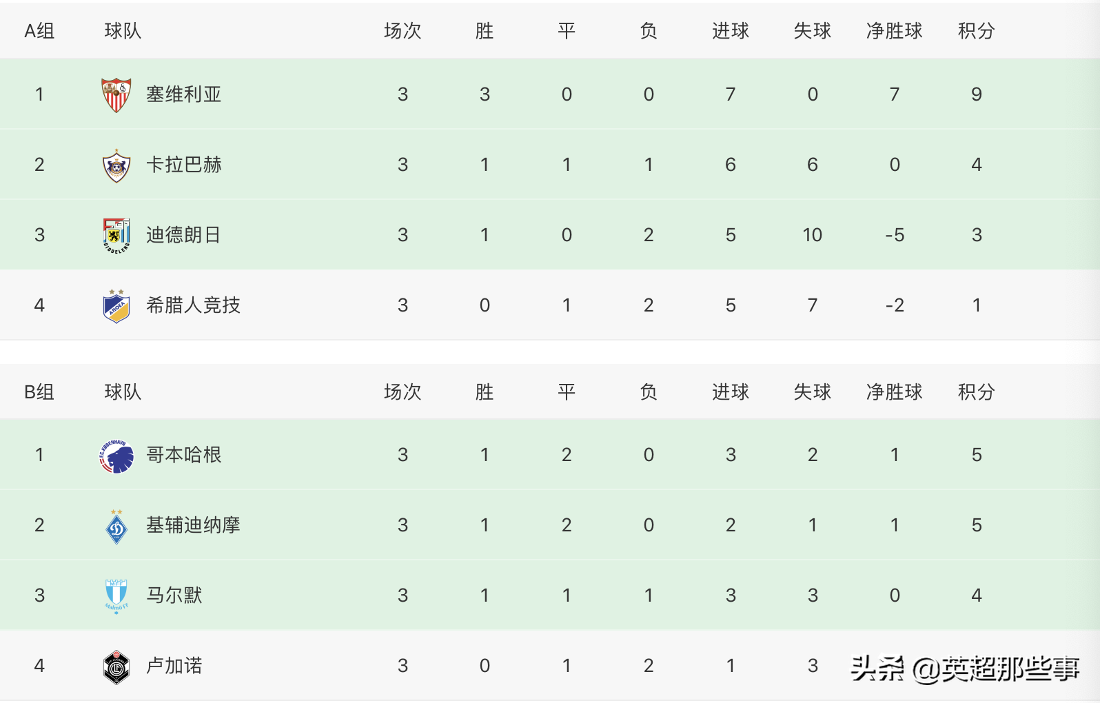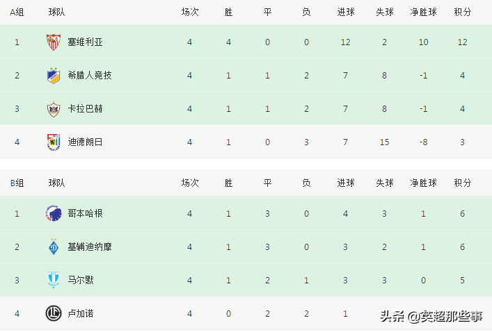 A组中,塞维利亚主场3-0完胜迪朗德日,豪取3连胜领跑,巴斯克斯梅开二度;卡拉巴赫主场2-2战平希腊人竞技,升至积分榜第二位。B组中,哥本哈根客场1-1战平基辅迪纳摩,继续位列小组第一,马尔默主场2-1击败卢加诺,取得首胜升至第3位。