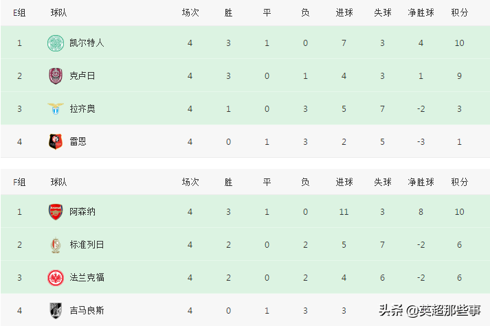 E组中,凯尔特人客场2-1逆转绝杀拉齐奥,提前获得出线权,克鲁日主场1-0击败雷恩,再拿1分就能出线,意甲劲旅拉齐奥已经濒临出局。F组中,阿森纳客场1-1战平吉马良斯,后2场再拿1场平局就能确保出线,标准列日主场2-1击败法兰克福,积分追平对手,2队将竞争另一个出线名额。