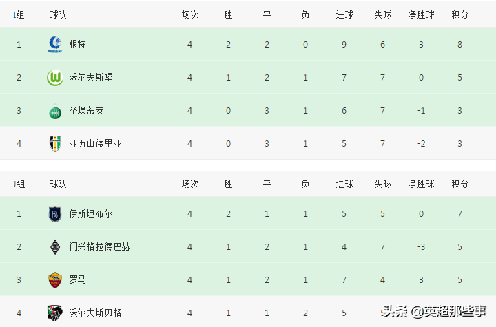 I组中,根特客场3-1击败沃尔夫斯堡,3分优势领跑积分榜,实际上已经提前出线,亚历山德里亚主场2-2战平圣埃蒂安,依然小组垫底,本组的另一个出线名额很不明朗。J组中,门兴主场2-1力克罗马,两队同积5分,伊斯坦布尔客场3-0完胜沃尔夫斯贝格,升至榜首。
