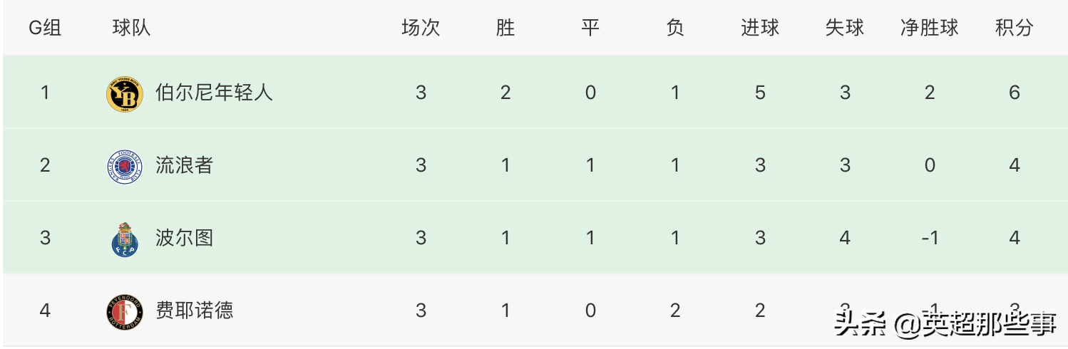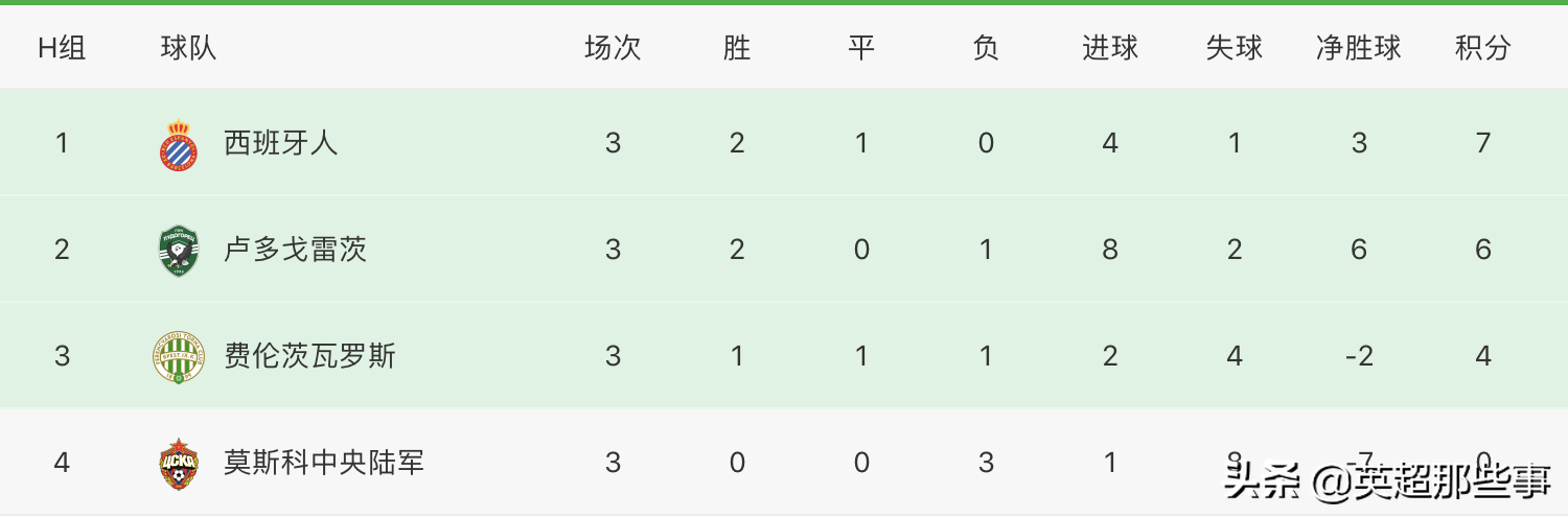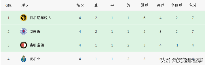 G组中,格拉斯哥流浪者主场2-0击败波尔图,升至积分榜第2位,费耶诺德主场1-1战平年轻人,年轻人依然居榜首。H组中,西班牙人主场6-0横扫卢多戈雷茨,积10分提前出线,费伦茨瓦罗主场0-0战平莫斯科中央陆军,仍有出线主动权。