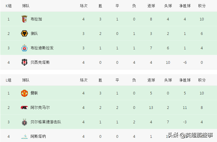 K组中,狼队主场1-0击败布拉迪斯拉发,升至积分榜第二位,布拉加主场3-1击败贝西克塔斯,出线已经咫尺之遥。L组中,曼联主场3-0大胜贝尔格莱德游击,三前锋一齐进球,曼联领先游击6分,胜负关系占优,已经提前出线;阿尔克马尔客场5-0大胜阿斯塔纳,位列小组第二。
