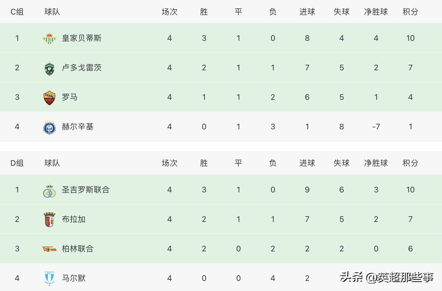 C组中,皇家贝蒂斯主场1-1战平罗马,提前2轮锁定小组前二,罗马落后6分且相互交锋处于劣势,已经无缘小组第一,只能和卢多戈雷茨拼一下小组第二。D组中,圣吉罗斯联合积10分居首,德甲劲旅柏林联合取得2连胜后,积6分位列第3,依旧有争夺小组第一的希望。