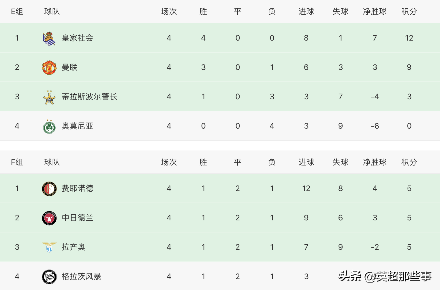 E组中,皇家社会豪取4连胜,锁定小组前二,曼联主场1-0绝杀奥莫尼亚,落后3分,但还未锁定前二,他们下一轮将对战警长,只要不败就能确保前二;F组中,再次出现了神奇的一幕,本轮2场比赛都战平,4支球队同样是1胜2平1负,同积5分,悬念大大的。