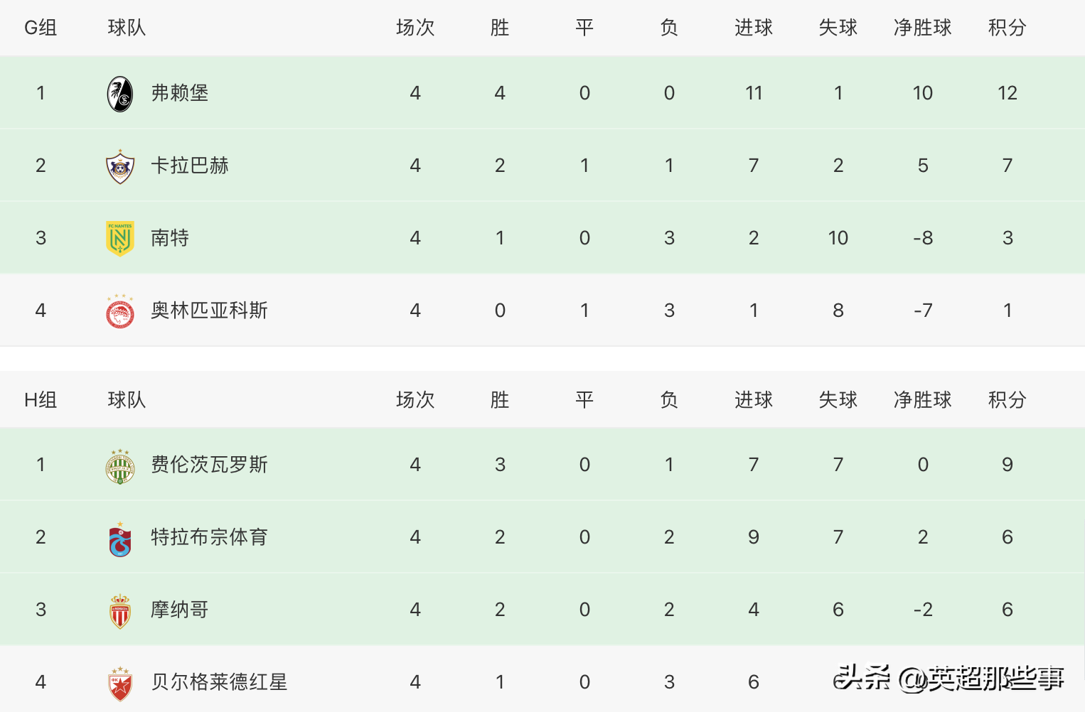 G组中,弗赖堡豪取4连胜,提前锁定前二,卡拉巴赫落后5分,2大名队南特和奥林匹亚科斯表现不佳;H组中,费伦茨瓦罗斯、特拉布宗体育和摩纳哥争夺小组第一,贝尔格莱德红星虽然垫底,也还有争小组第二的希望。