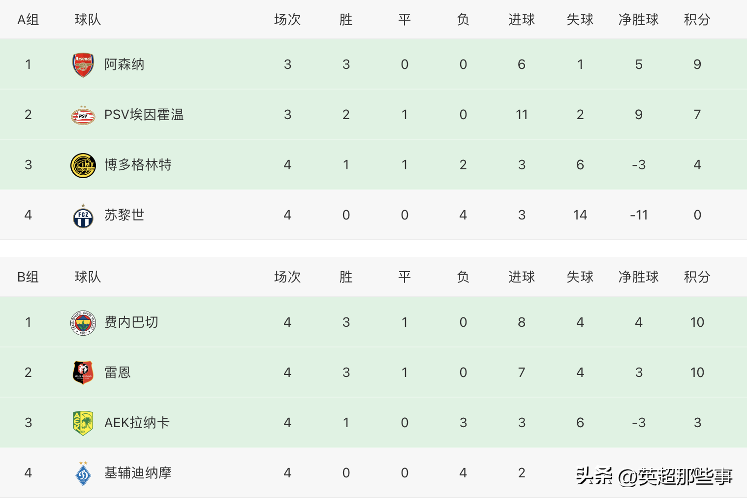 A组中,阿森纳客场1-0击败博德闪耀,取得3连胜继续领跑,领先埃因霍温2分,两队之间还有一场补赛,将至关重要!B组中,费内巴切和雷恩分别击败对手,两队同积10分位列前2位,已经提前2轮锁定小组前二,后面的直接交手将决定小组第一的归属。