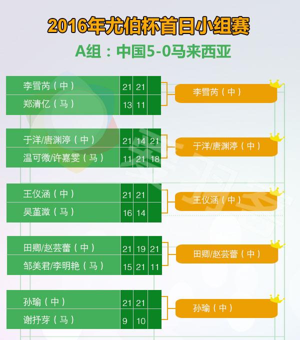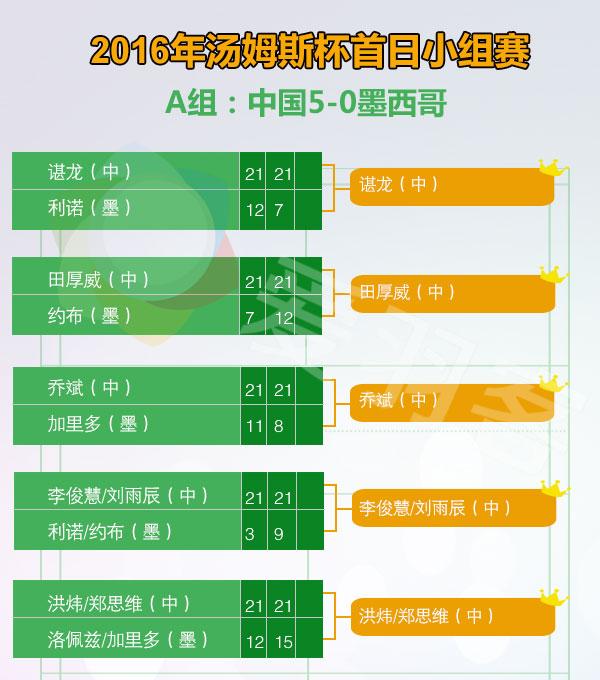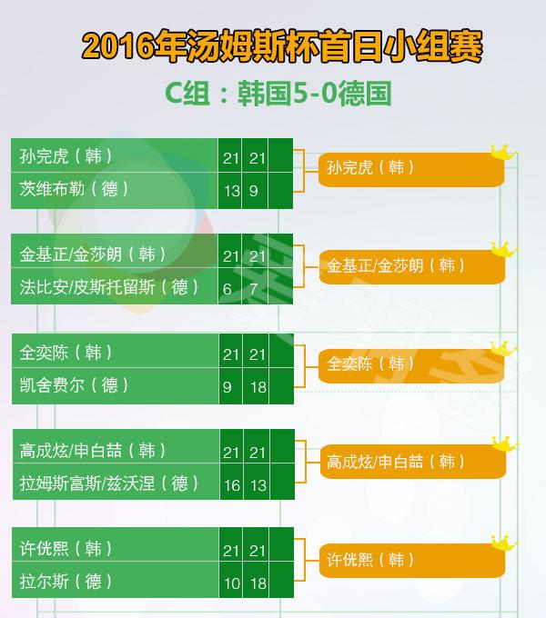 5月15日,2016年汤尤杯首日小组赛部分比赛已经结束。缺少斯里坎特的印度男队2-3不敌泰国队,韩国男队5-0血洗德国队,泰国女队4-1战胜中国香港,印尼女队5-0战胜保加利亚。