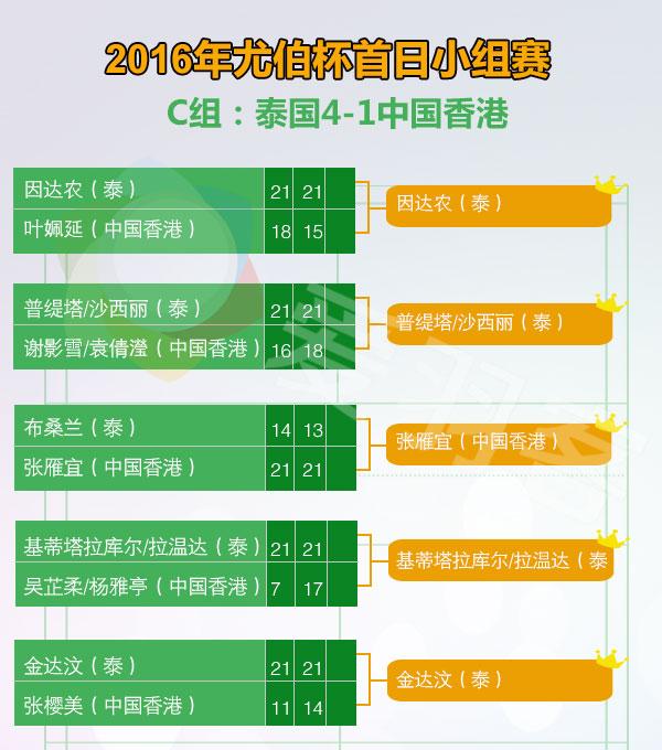 泰国一姐因达农21-18、21-15战胜中国香港一单叶姵延。在剩余的4场比赛中,泰国队仅布桑兰0-2不敌张雁宜丢分,其余队友均获胜,泰国队以总比分4-1战胜中国香港。