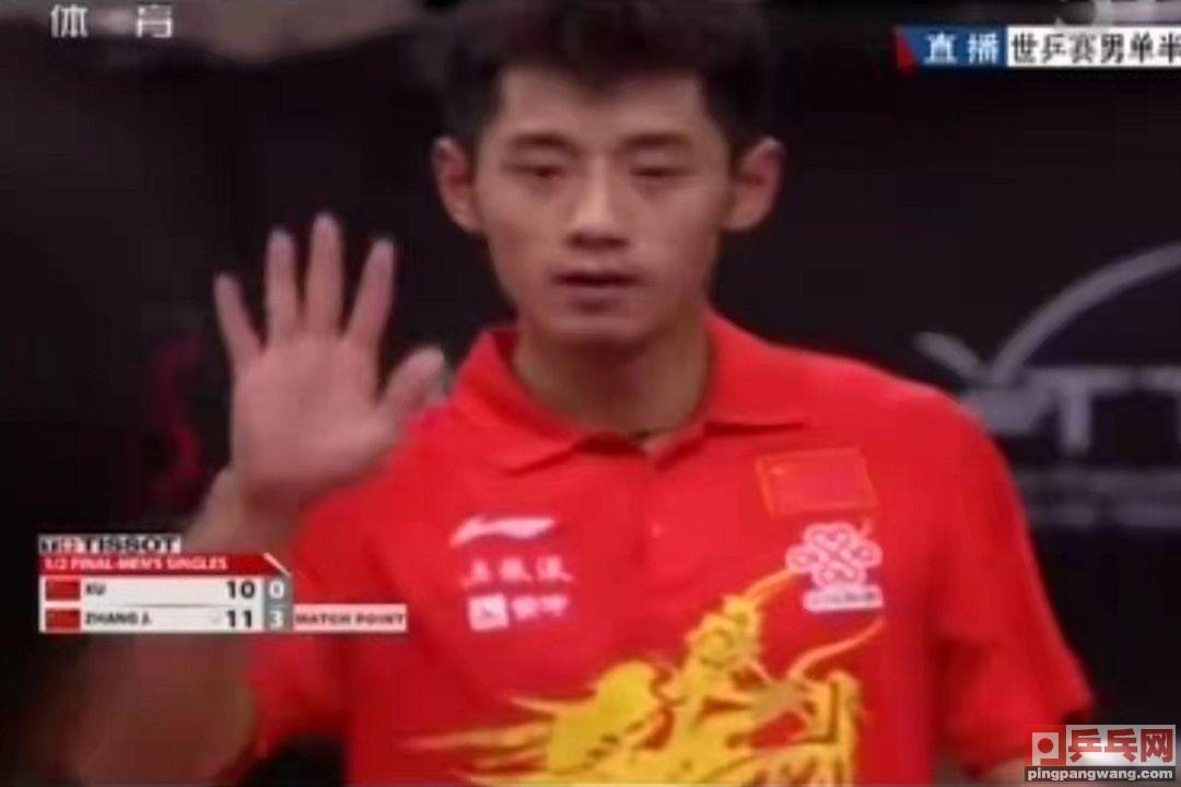 许昕发球,张继科摆短,许昕再摆,张继科反手拧拉斜线,许昕正手反拉,张继科侧身正手暴冲直线,11-10拿到赛点。