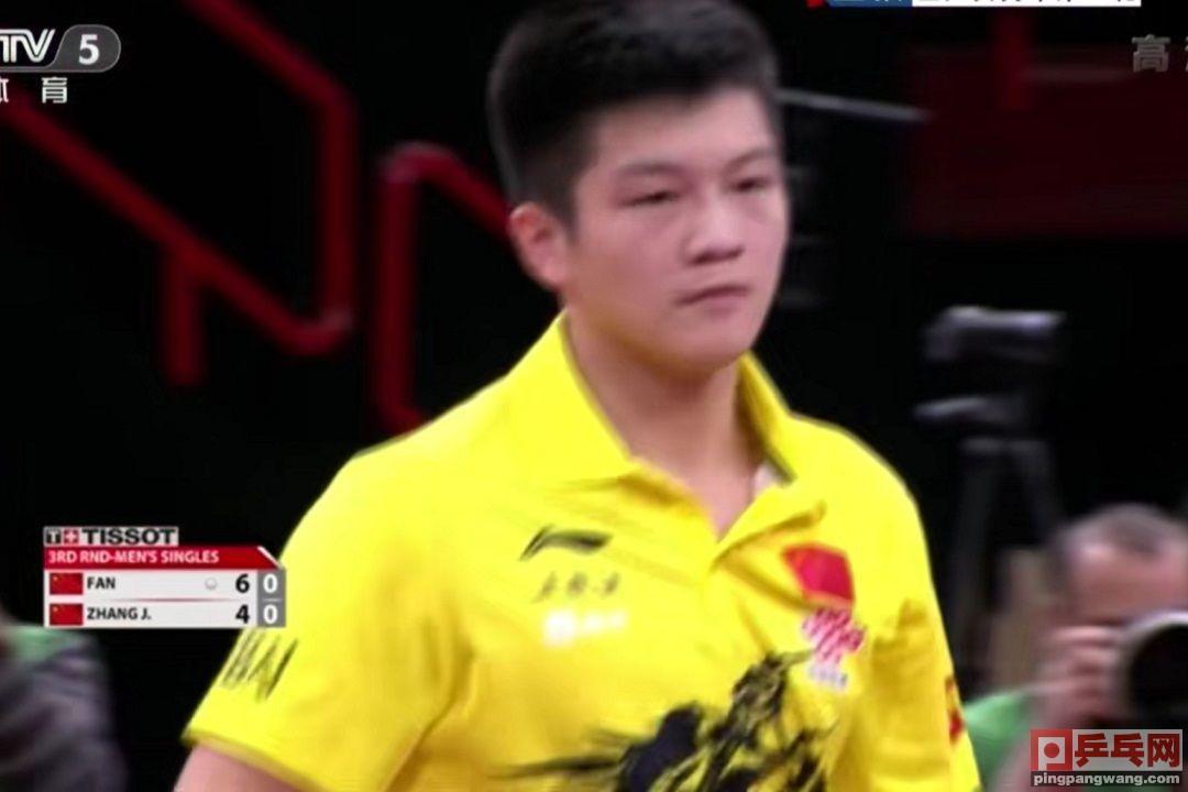 樊振东发球,张继科摆短,樊振东反手拉球出界,6-0。
