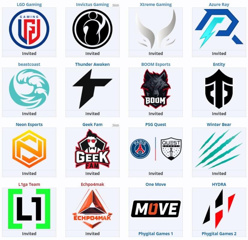 本次比赛共有16支战队参加了本次比赛,其中中国战队包括XG、LGD、iG和AR。四支中国战队在小组赛中被分至四个小组,XG、LGD、iG各自连胜两场晋级淘汰赛第二轮,AR则是小组赛一胜进入淘汰赛首轮。
