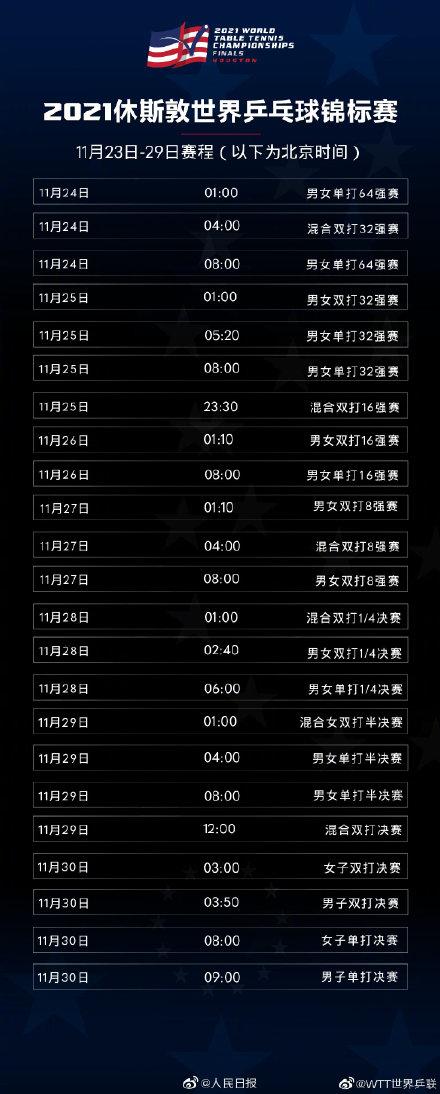 2021年休斯敦世乒赛将于北京时间11月24日凌晨打响。中国乒乓球队已抵达休斯敦,并投入到赛前训练中。收藏这张赛程表为中国队加油!(WTT世界乒联)
