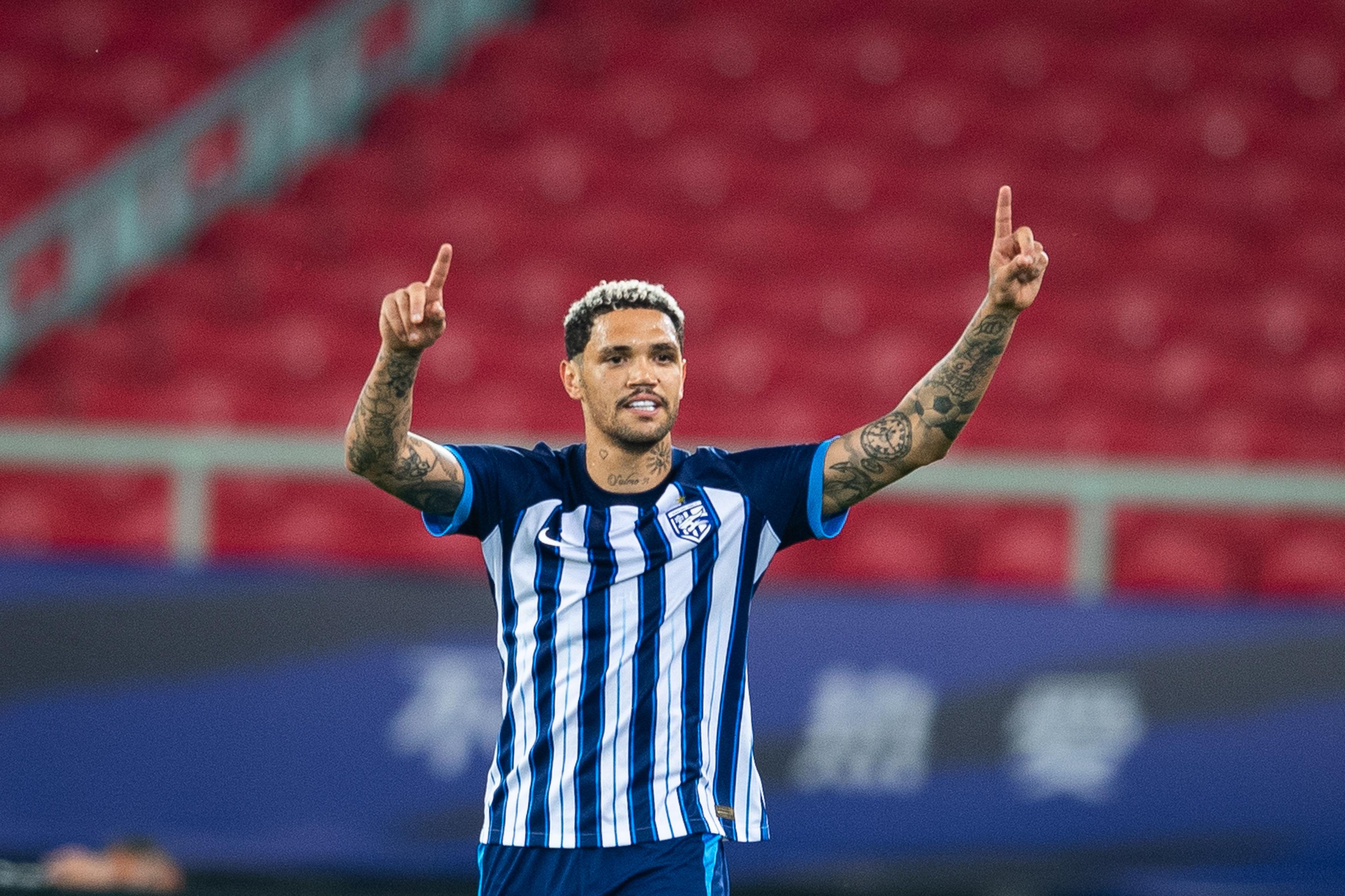 5月5日,武汉三镇队球员恩里克在罚进点球后庆祝。 新华社记者 肖艺九 摄