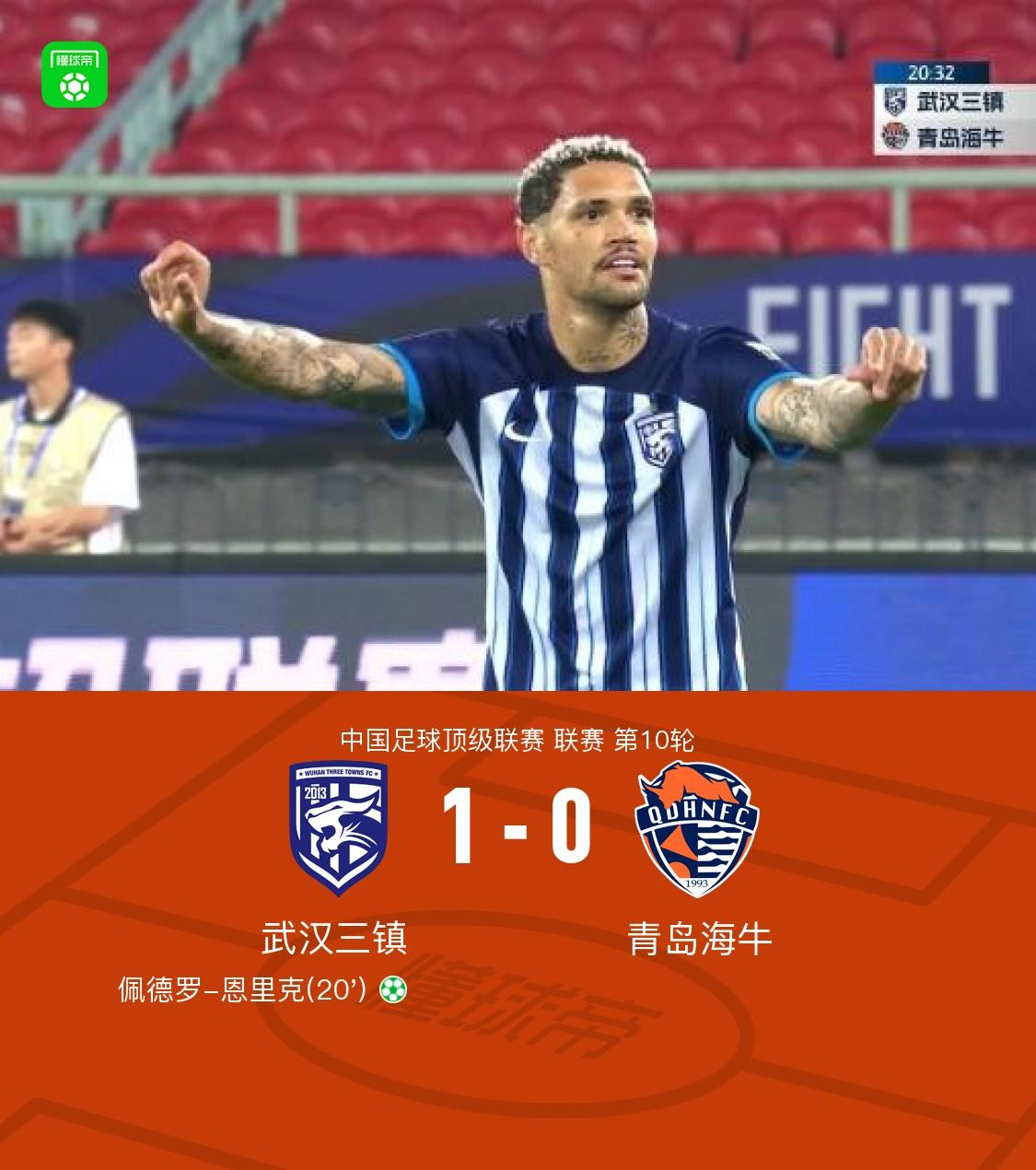 北京时间5月5日中超联赛第10轮,武汉三镇主场对阵青岛海牛。比赛第20分钟,刘军帅踢倒陶强龙送点,佩德罗-恩里克点射破门。最终比分武汉三镇 1- 0 青岛海牛。