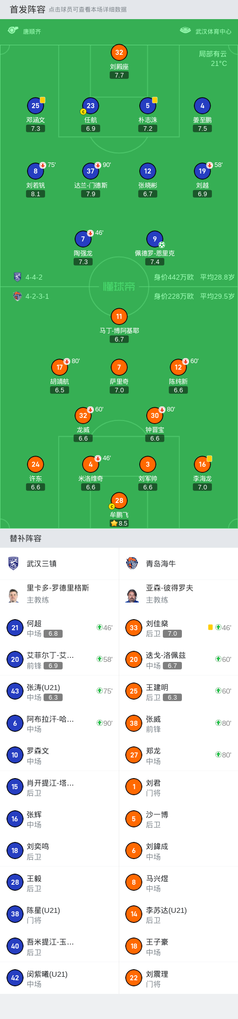 武汉三镇阵容:22-刘殿座/2-李扬(57分钟 23-任航)、5-朴志洙、18-刘奕鸣/28-王毅(81分钟 17-陈宇浩)、8-严鼎皓(57分钟 24-段刘愚)、10-斯坦丘、21-何超、30-谢鹏飞(76分钟 29-陶强龙)/11-戴维森(57分钟 9-阿齐兹)、13-马尔康