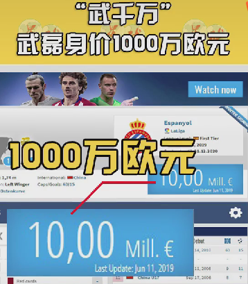 据数据显示,2020年,武磊的转会费最高在1000万欧元,2021年5月是200万欧元。