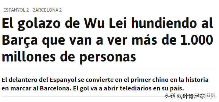 《世界体育报》、《阿斯报》这些西班牙本土媒体,也是一片惊叹。《阿斯报》写道,武磊击沉巴萨的这个进球,会在中国播放10亿(你没看错,是10亿)次!《每日体育报》给武磊打出全队最高的7分,《马卡报》的评分,武磊比梅西还高……