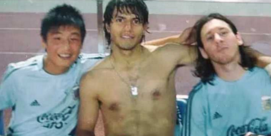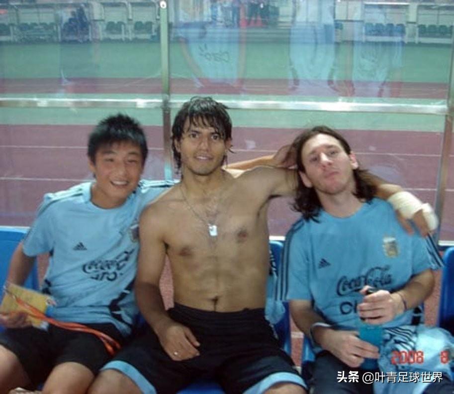 这是2008年奥运会男足赛事期间,阿根廷国奥在上海备战训练。当时,武磊还是球童,而梅西已经名满天下。16岁的武磊找到梅西拍了一张合影,阿圭罗也在照片之中。