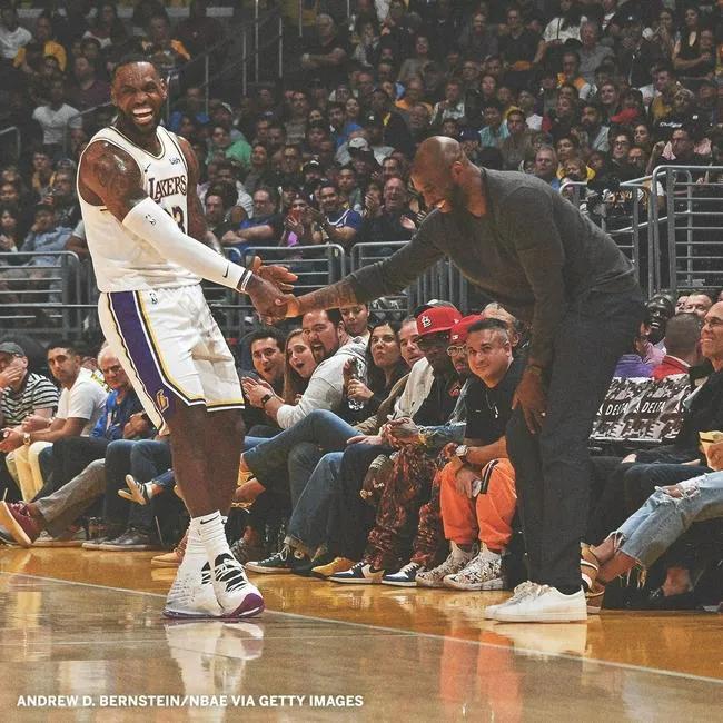 比赛过程中,詹姆斯与科比击掌。