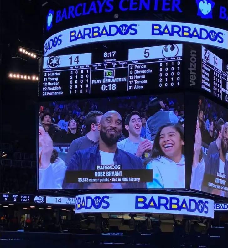 篮网主场播放科比与吉安娜画面。