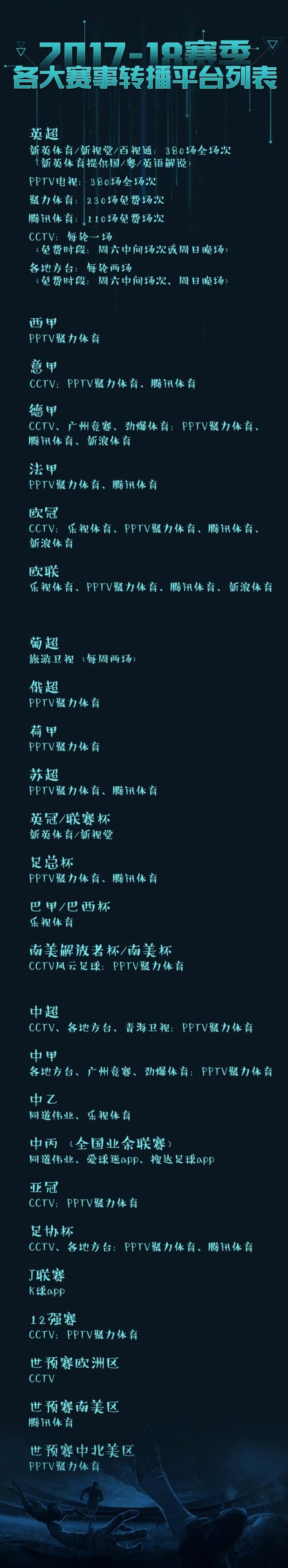 新赛季各大联赛已经陆续开幕,欧冠、欧联小组赛抽签也已完成,对广大球迷来说其中一项最为关心的事情,就是这些比赛都在哪些平台能够看到。搜达足球在这里为各位进行了一番整理,具体就是以下这张长图了——