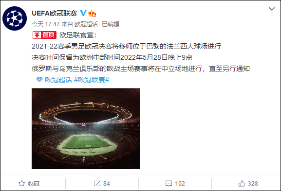 UEFA欧洲冠军联赛官方微博2月25日消息,欧足联官宣:2021-22赛季男足欧冠决赛将在巴黎法兰西大球场进行,决赛时间为欧洲中部时间2022年5月28日晚上9点。俄罗斯与乌克兰俱乐部的欧战主场赛事将在中立场地进行,直到另行通知。