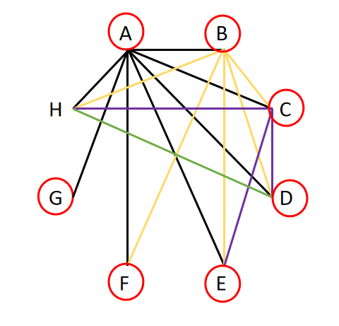 确定A选手比赛情况后,G选手就也确定了(因为这名选手只进行1场比赛),所以A、G同时画圈;确定B选手比赛情况后,F选手也就确定了(因为这名选手只进行2场比赛),所以B、F同时画圈;确定C选手比赛情况后,E选手也就确定了(因为这名选手只进行3场比赛),所以C、E同时画圈。确定完每个选手比赛情况后,数与H连接的线段就得到答案。