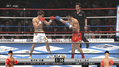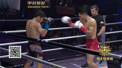 《万茗堂·勇士的荣耀一》中,第一回合对手中村敏射还未进入状态,魏锐已经洞察了他的弱点。魏锐发挥控场优势打乱对方的进攻节奏,并在一次进攻中将对手逼至擂台边角。紧接着,魏锐找准时机施展跳膝,一招KO对手!