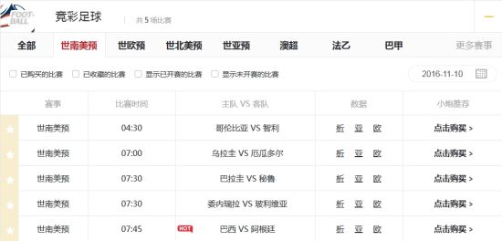 北京时间2016年11月11日(周五)7:45,世界杯南美区预选赛一场焦点对决,巴西将坐镇主场迎战阿根廷。巴西目前排名小组第1拿到21分,但领先优势不足以让他们满意;而阿根廷仅仅排名第5拿到16分,这也是阿根廷绝对不能接受的。本场比赛两队势必要殊死一拼,从目前新浪彩票智能预测数据以及各大博彩公司开出的盘赔看,巴西优势是毋庸置疑的。