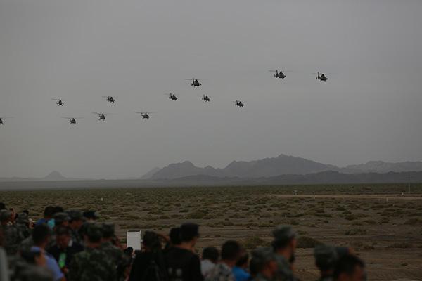 陆航直升机梯队超低空过场。澎湃新闻记者 谢匡时 图